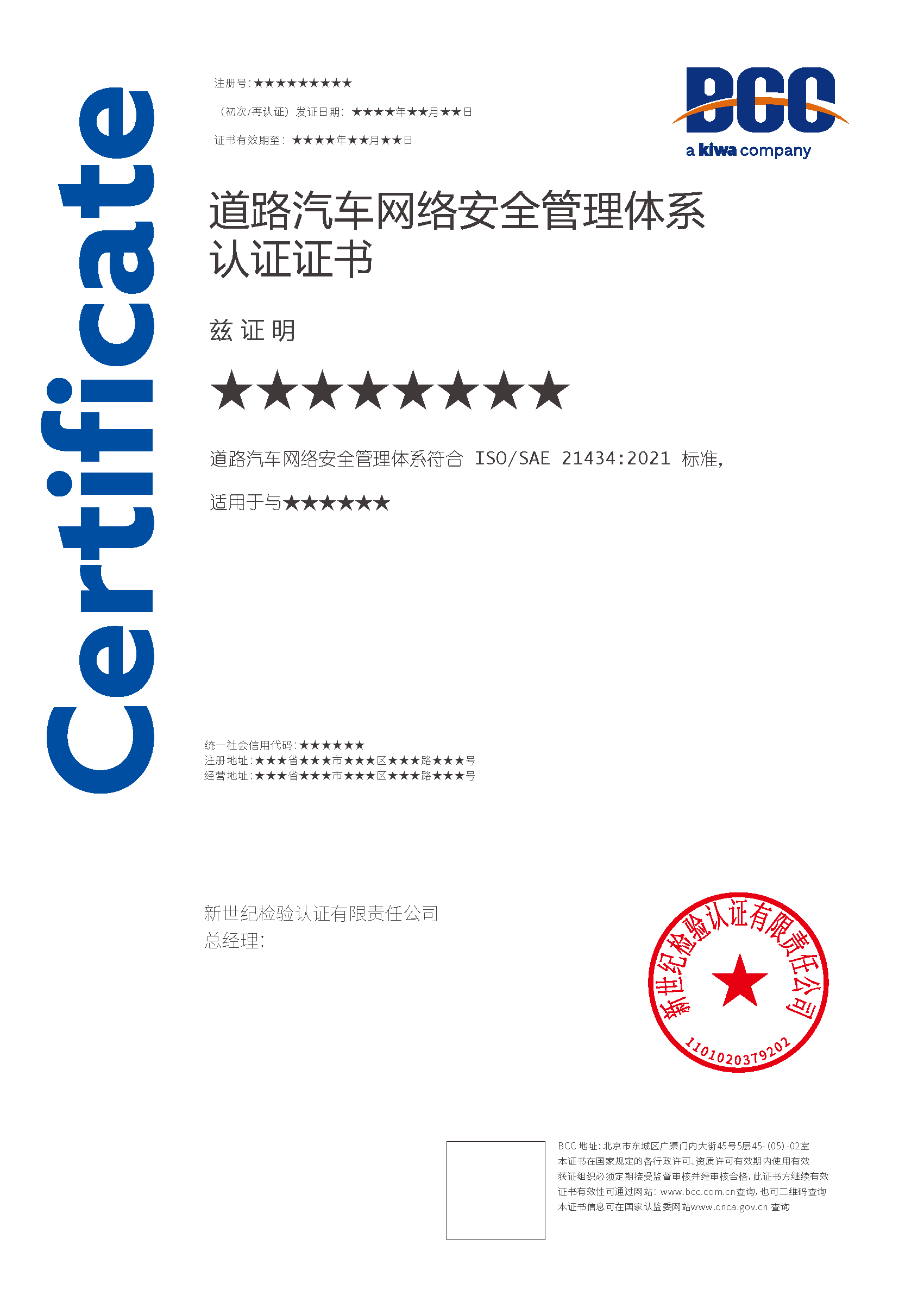 本頁涉及的認證服務中均有對應的《認證實施規(guī)則》,BCC擁有其最終解釋權。任何組織及個人未經(jīng)BCC許可,不得以任何形式全部或部分使用(法律要求除外)認證相關信息。如需獲取相關實施規(guī)則請用以下方式聯(lián)系獲?。弘娫挘?10-58579316   郵箱:fwjs@kiwa.cn