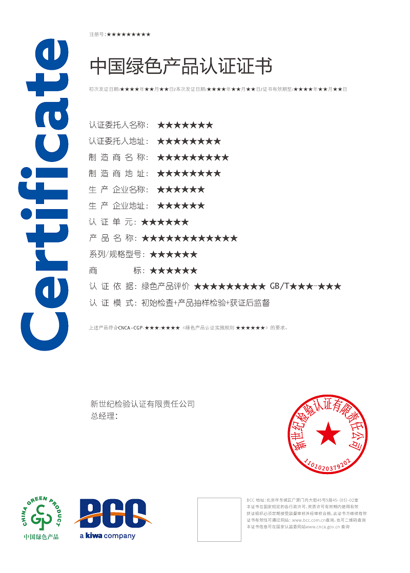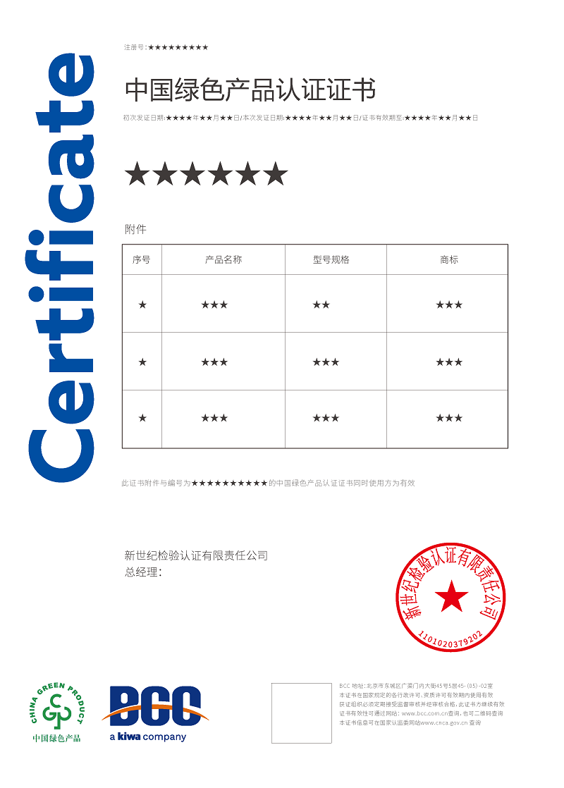 目前,BCC已順利通過國家認證認可監(jiān)督管理委員會(CNCA)審批,獲得了多項綠色產(chǎn)品認證資質(zhì),包括: