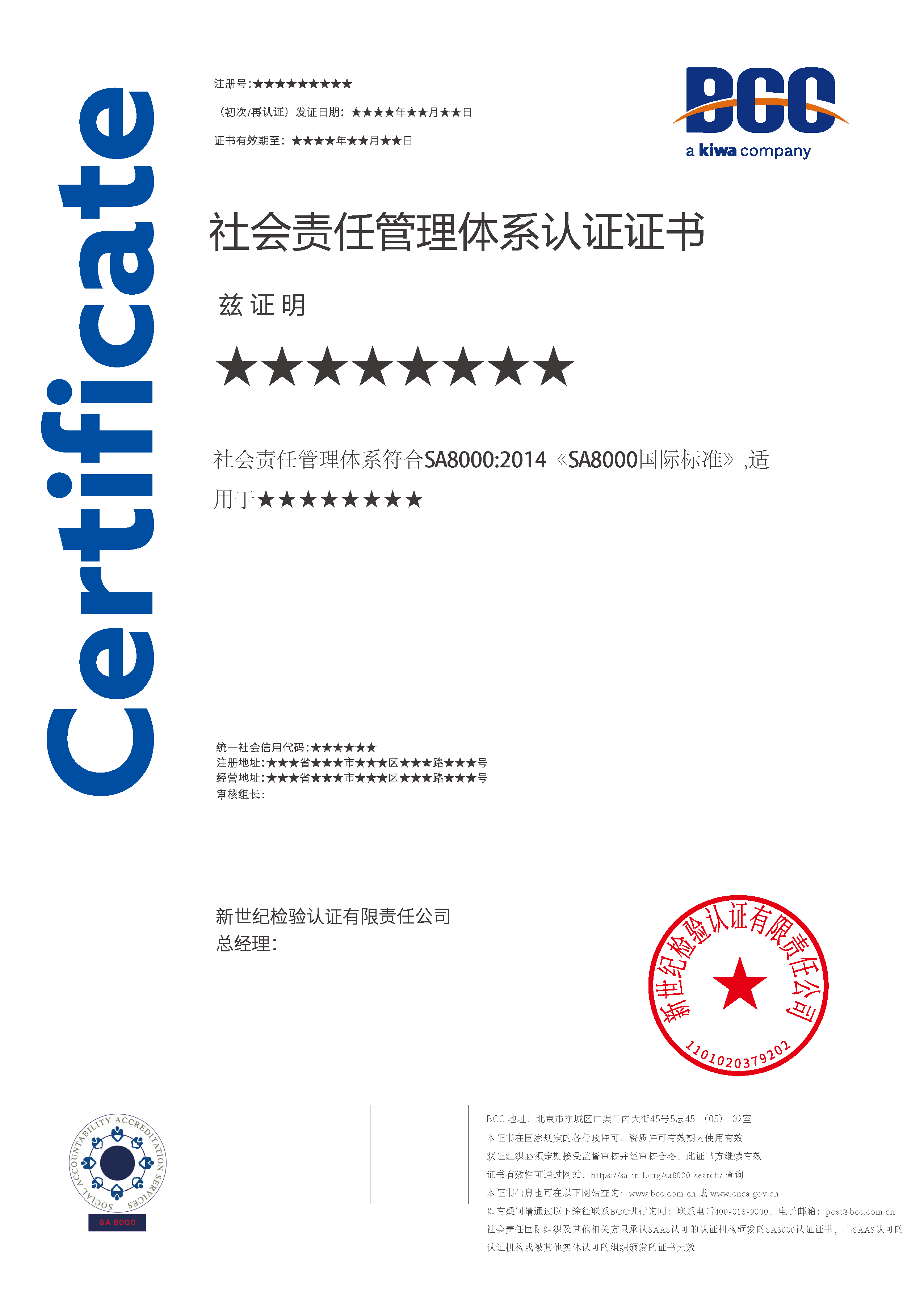 現(xiàn)行SA8000認(rèn)證使用的標(biāo)準(zhǔn)是SA8000:2014,該標(biāo)準(zhǔn)是由美國SAI(社會責(zé)任國際組織)制定發(fā)布的。SA8000標(biāo)準(zhǔn)涵蓋九個方面:童工、強迫勞動、健康與安全、結(jié)社自由及集體談判的權(quán)利、歧視、懲罰措施、工作時間、報酬和管理體系。
