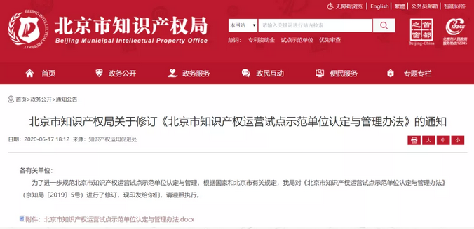 同日,為培育一批知識產(chǎn)權(quán)運營能力強、成效好、具有示范效應(yīng)的知識產(chǎn)權(quán)運營機構(gòu),發(fā)揮其在北京市知識產(chǎn)權(quán)運營體系建設(shè)工作中的支撐作用,促進北京市知識產(chǎn)權(quán)運營市場發(fā)展,加快全國科技創(chuàng)新中心和知識產(chǎn)權(quán)首善之區(qū)建設(shè),北京市知識產(chǎn)權(quán)局修訂并發(fā)布《北京市知識產(chǎn)權(quán)運營試點示范單位認定與管理辦法》(京知局〔2020〕172號)。