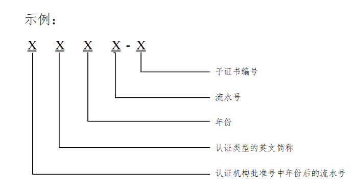 內(nèi)資認證機構認證證書編號為該機構批準號的3位或4位阿拉伯數(shù)字流水號;外資認證機構認證證書編號為F+該機構批準號的2位或3位阿拉伯數(shù)字流水號。
