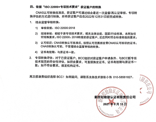 • 2021年7月1日(含)后通過認(rèn)證決定的,依據(jù)本告知書第四條款通過專項(xiàng)轉(zhuǎn)換評(píng)估后,經(jīng)評(píng)估符合要求的,頒發(fā)依據(jù)“ISO22000:2018”的認(rèn)證證書;經(jīng)評(píng)估不符合要求的,頒發(fā)BCC機(jī)構(gòu)證書;