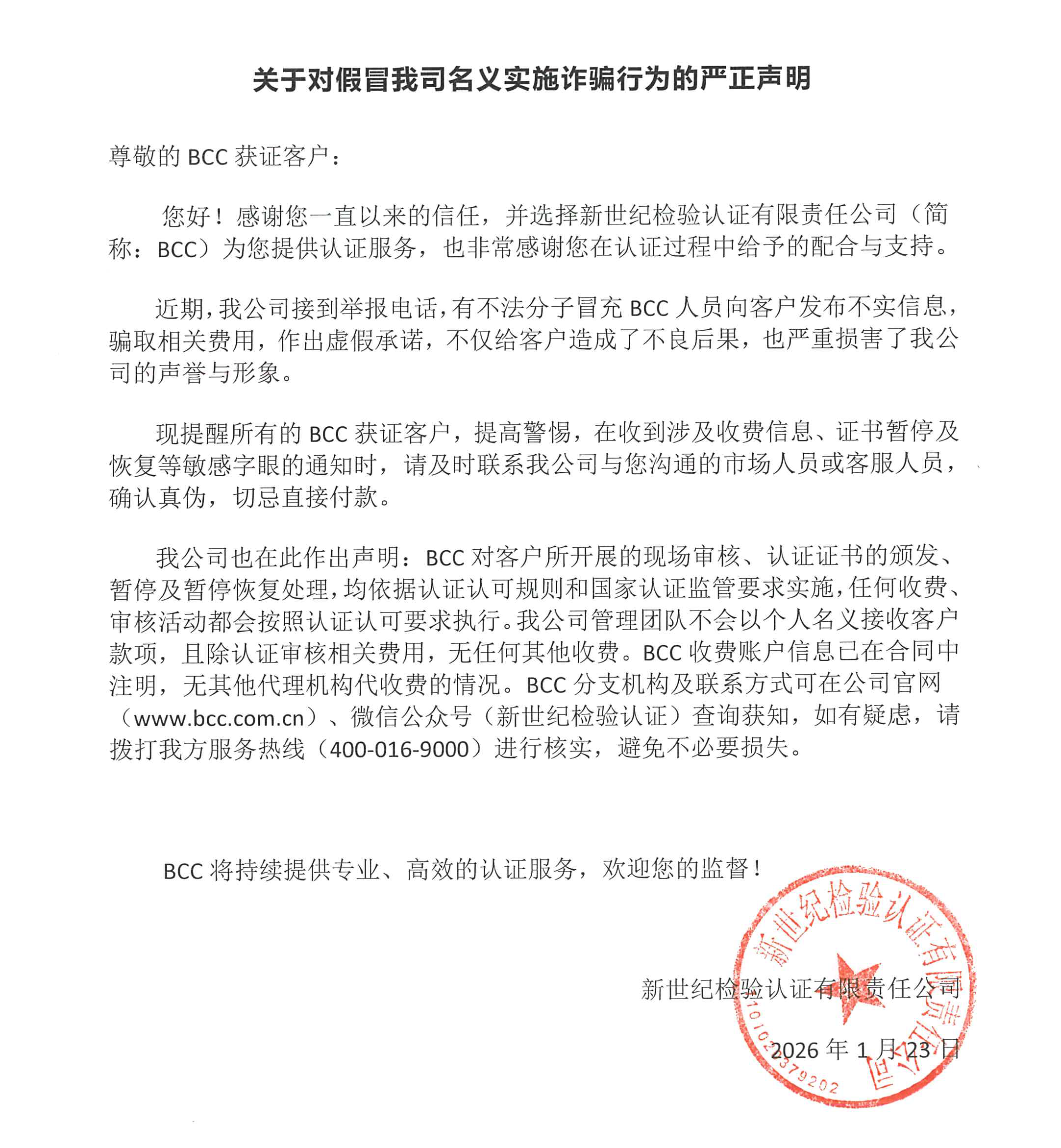 我公司也在此作出聲明:BCC對客戶所開展的現(xiàn)場審核、認證證書的頒發(fā)、暫停及暫?;謴吞幚?,均依據(jù)認證認可規(guī)則和國家認證監(jiān)管要求實施,任何收費、審核活動都會按照認證認可要求執(zhí)行。我公司管理團隊不會以個人名義接收客戶款項,且除認證審核相關(guān)費用,無任何其他收費。BCC收費賬戶信息已在合同中注明,無其他代理機構(gòu)代收費的情況。BCC分支機構(gòu)及聯(lián)系方式可在公司官網(wǎng)(www.dglgag.com)、微信公眾號(新世紀檢驗認證)查詢獲知,如有疑慮,請撥打我方服務(wù)熱線(400-016-9000)進行核實,避免不必要損失。