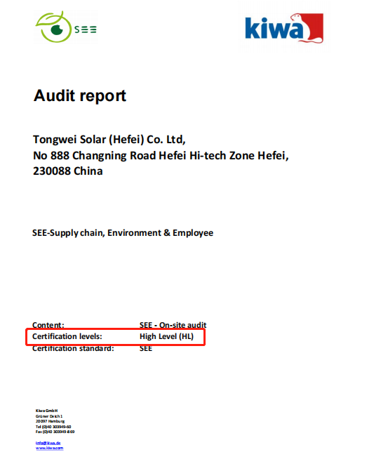 作為全球認(rèn)證領(lǐng)域20強(qiáng)企業(yè),Kiwa集團(tuán)專家與Kiwa BCC專家對(duì)企業(yè)進(jìn)行了現(xiàn)場審核、通過員工訪談,以及文件評(píng)審等工作,最終為通威太陽能頒發(fā)了首份依據(jù)SEE標(biāo)準(zhǔn)的ESG現(xiàn)場評(píng)估報(bào)告,并高度評(píng)價(jià)了通威太陽能在ESG管理方面的突出表現(xiàn)。報(bào)告涵蓋可持續(xù)的企業(yè)治理、供應(yīng)鏈管理、員工權(quán)益、環(huán)境管理四個(gè)部分,總計(jì)約50個(gè)主題,在全球范圍內(nèi)有著較高且廣泛的客戶接受度和權(quán)威公信力。